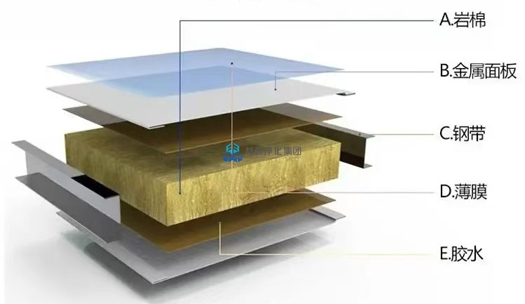 两长边镀锌钢带封边,内部填充芯材,通过高速连续自动化成型机加温、加压复合、修编、开槽、下料而成型的新一代建筑装潢板材
