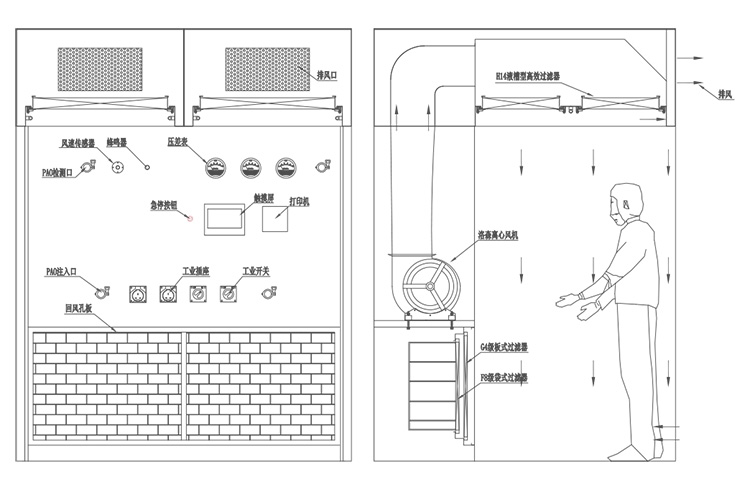 | 型号 | 外形尺寸 L×W×D | 工作区 L×W | 额定风速(m/s) | 工作区洁净度 | 噪音(dB) | 照度(Lx) | 电源功率(kW) |