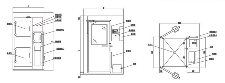 雾淋室用于实验室或车间等特殊环境下,为确保生产过程中或生产结束后,人员离开车间时 ,通过雾淋去除洁净服表面粘附的活性或毒性粉尘颗粒的设备。该设备有四大系统组成 :围护结构、水系统 、喷雾系统、自控系统,围护结构使用304不锈钢材料拼装成型 ,每个雾淋室相互独立;水系统是由水泵、管道 、阀门 、传感器等组成,为雾淋室供水 ;喷雾系统设置细水雾和大水雾两种模式,可自由切换;自控系统由PLC、液晶屏及相关自控原件组成,雾淋时间可现场设置,进出门电子互锁。